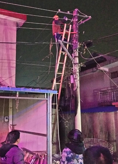 東辛“電雷鋒”們在寒夜接到故障消息后,第一時間趕赴現(xiàn)場,他們克服道路冰凍行走困難、電桿覆冰攀爬濕滑等不利因素,頂著刺骨的寒風,咬緊牙關一步一個腳印,仔細進行設備檢查和維修,在桿上艱難地完成每一個動作,一刻也沒有停歇,以最快速度搶修受損線路恢復居民用電。