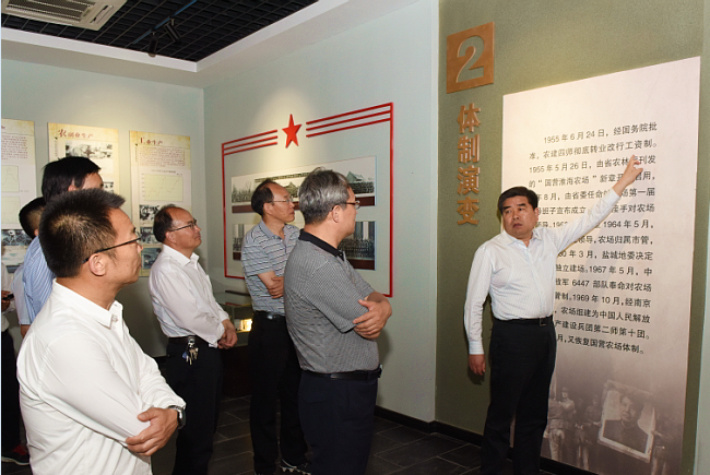 沿著農建四師紀念碑雕像,毛澤東主席關于生產待命、建設農場的命令碑文和農建四師暨淮海農場歷史陳列館,鄧慶海看得認真,聽得仔細,不時記下珍貴史料。農建四師紀念碑雕像的含義,毛主席命令碑文,陳列館中的許多老照片、老物件和軍墾文化的情況介紹,鄧慶海都了然于心,對有的圖片、文字,他還掏出手機拍照留存。鄧慶海強調,農建四師是一支英雄的部隊,陳列館內史料豐富、內容詳實,是一個軍墾傳統文化教育的好平臺。今后要繼續發揮好陳列館的紅色教育作用,繼承發揚“艱苦奮斗、勇于奉獻、開拓創新”的蘇墾精神,讓更多人的思想在這里得到軍墾傳統文化的洗禮。