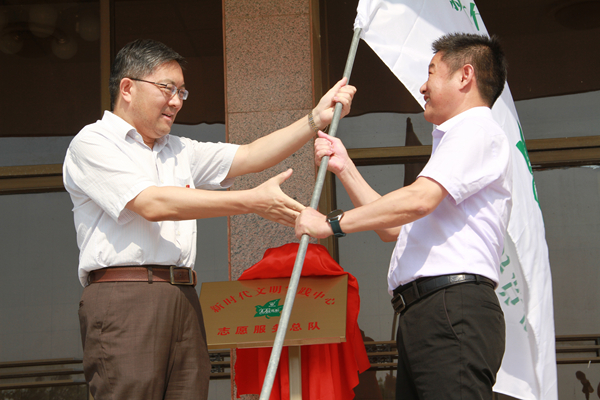 在揭牌授旗儀式上,姚準明和董光威為新洋農場新時代文明實踐中心揭牌。楊義林向新洋農場有限公司黨委副書記、董事長、總經理潘元海授新洋農場志愿者服務總隊隊旗。新洋農場有限公司黨委書記陳守軍致辭。