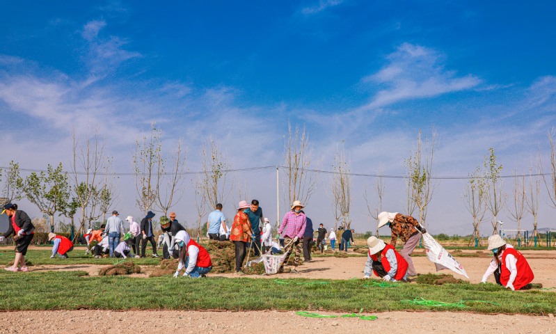 “草皮之間要留有空隙,讓它的根可以生長(zhǎng),大家鋪的時(shí)候注意一些。”“這邊的草皮馬上就要鋪完了,快讓運(yùn)送車再裝一車草皮過(guò)來(lái)。”……