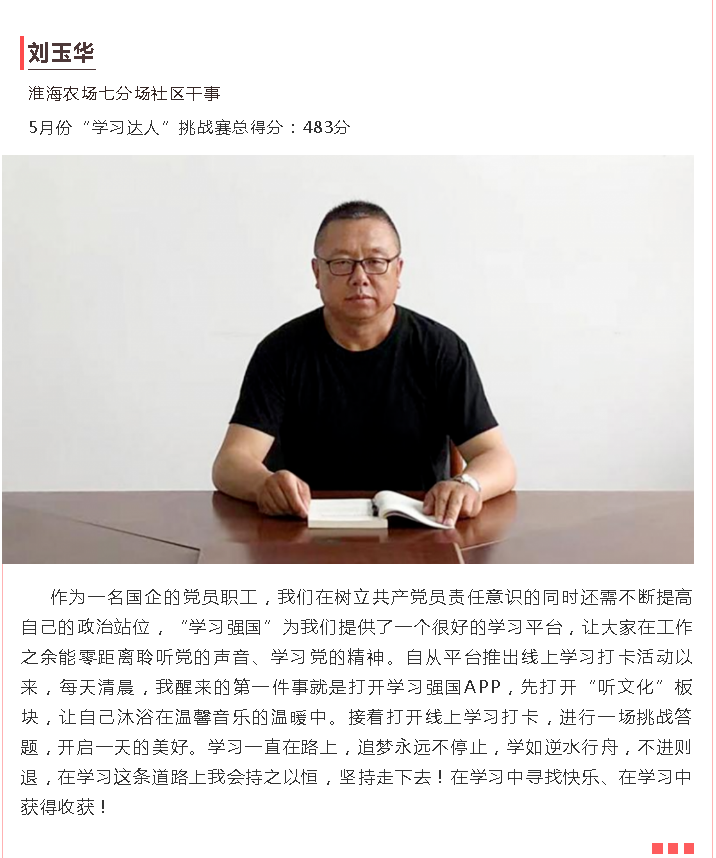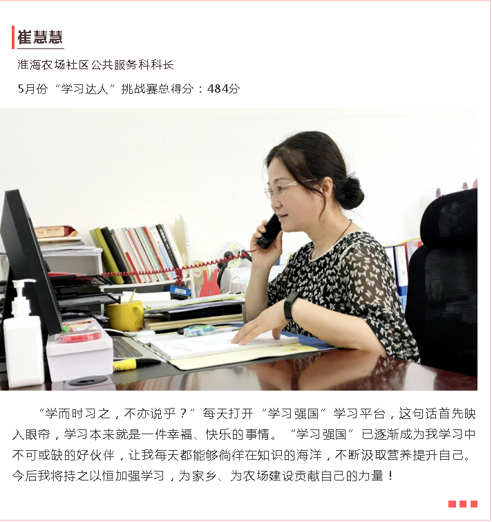 為充分展示“學(xué)習(xí)達(dá)人”風(fēng)采,根據(jù)射陽縣“強(qiáng)國復(fù)興有我”群眾性主題宣傳教育活動安排,射陽宣傳推出“訪學(xué)習(xí)達(dá)人看家鄉(xiāng)變化”主題尋訪萬里行活動第一期,在全縣5月份最厲害的11名“學(xué)習(xí)達(dá)人”中,淮海的“學(xué)習(xí)達(dá)人”馮輝、陳祥、崔慧慧、劉玉華躋身其中,讓我們一起來聽聽淮海的“學(xué)習(xí)達(dá)人”們在工作中、生活上的心得感悟吧!圖為淮海學(xué)員“學(xué)習(xí)達(dá)人”們的心聲感悟。