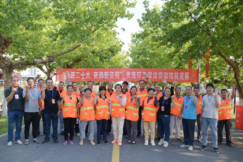 淮海農(nóng)場(chǎng)社區(qū)綠化環(huán)衛(wèi)所的環(huán)衛(wèi)職工,他們用辛勤的汗水和勤勞的雙手,守護(hù)著美麗淮海的“顏值”。環(huán)衛(wèi)人員也以他們兢兢業(yè)業(yè)的勞動(dòng)成果,贏得了農(nóng)場(chǎng)職工居民的廣泛贊譽(yù)和尊重。圖為結(jié)束比賽的環(huán)衛(wèi)職工和裁判人員開心地在標(biāo)語(yǔ)橫幅下合影留念。