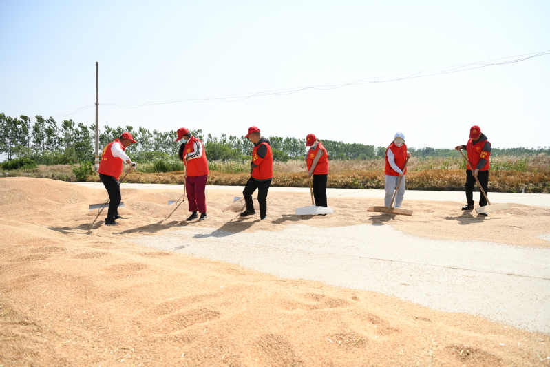 沖鋒在前,做好“助收員”。聞令而動、依令而行,社區黨組織組織黨員干部深入三夏工作一線,幫助生產區搶收晾曬,曬場上,大家頂著烈日,及時翻、晾登場小麥。