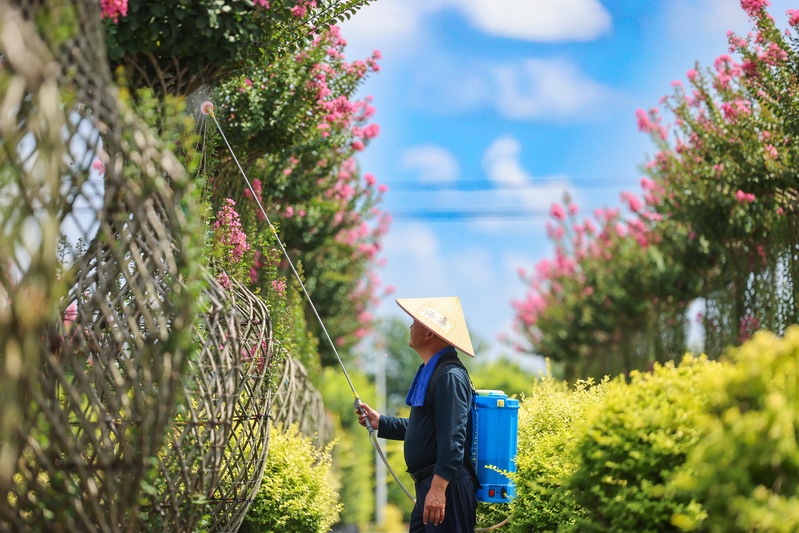 8月14日,江蘇省鹽城市射陽縣,在江蘇農墾新洋農場容器苗項目基地,管理人員正在為紫薇花瓶噴施藥物防病治蟲。據悉,新洋農場建成配有水肥一體、智能控制等設備的容器苗圃200畝。張偉生攝(中經視覺)