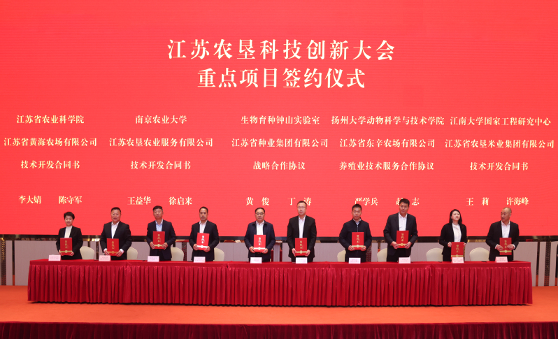 會上,吳本輝、姜建友共同為江蘇農墾漁業科技有限公司和江蘇省農墾產業技術研究院有限責任公司揭牌,吳本輝為蘇墾漁業研發中心、蘇墾米業研發中心、蘇墾麥芽科技創新中心、金太陽糧油研發中心、勤奮藥業研發中心、金象傳動研發中心授牌,姜建友發布江蘇農墾2024-2025年揭榜掛帥項目榜單,生物育種鐘山實驗室、省農科院、南京農業大學、江南大學、揚州大學分別與集團公司所屬企業簽署重點項目合作協議。