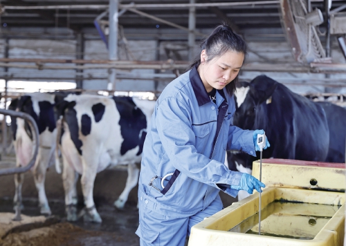 冬季低溫易引發肺炎威脅奶牛健康。春節期間,江蘇農墾東辛農場獸醫組技術人員實行24小時值守,密切關注牛只咳嗽、呼吸急促等疑似肺炎癥狀,及時采取隔離觀察和治療措施,全方位為奶牛健康服務。圖為技術人員檢查奶牛健康狀況。  劉興 攝