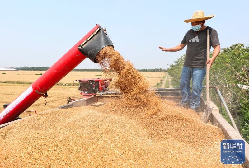 5月28日,江蘇農(nóng)墾三河農(nóng)場(chǎng)職工在裝車收割的小麥。新華社發(fā)(許昌銀攝)