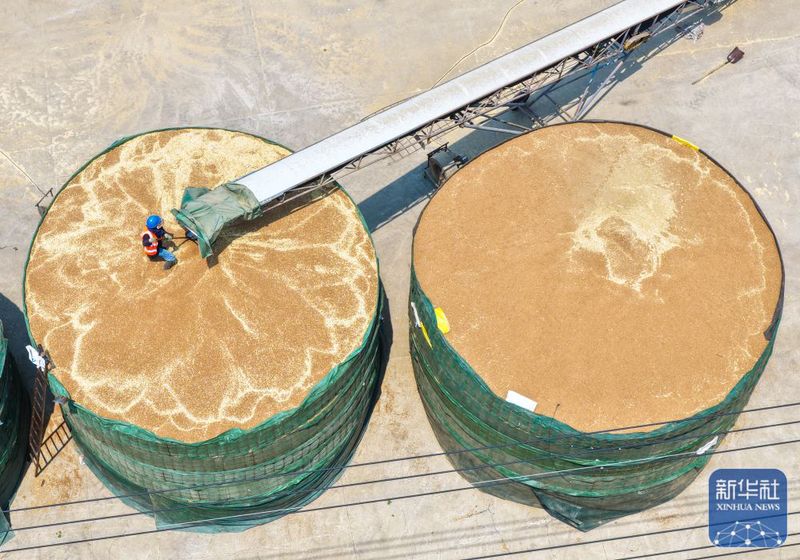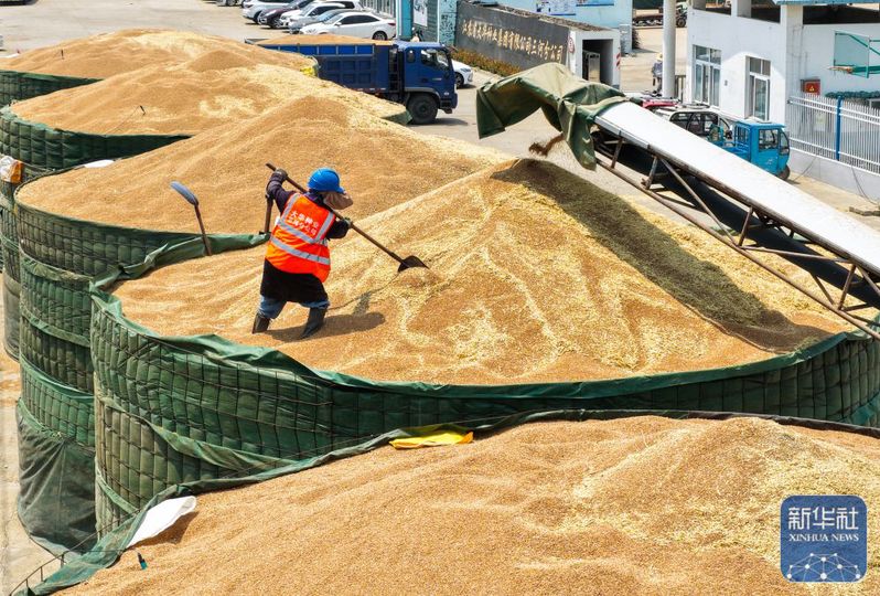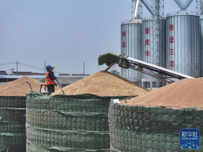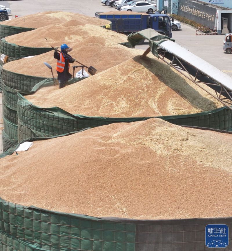 三河農(nóng)場(chǎng)收獲的小麥進(jìn)入大華種業(yè)三河分公司存儲(chǔ)(5月28日攝,無人機(jī)照片)。新華社記者 季春鵬 攝