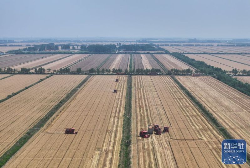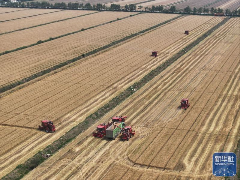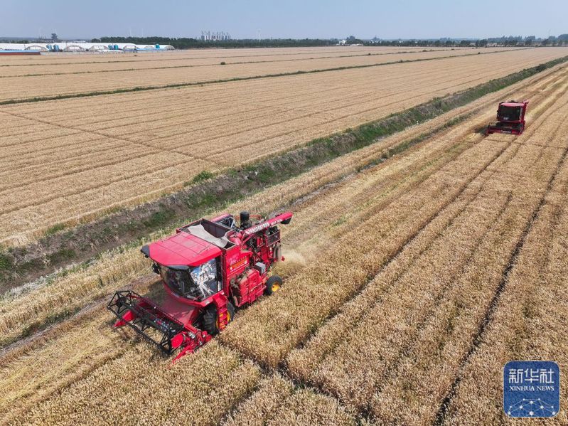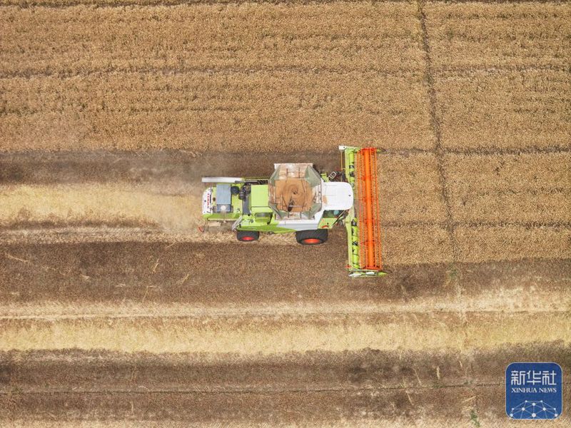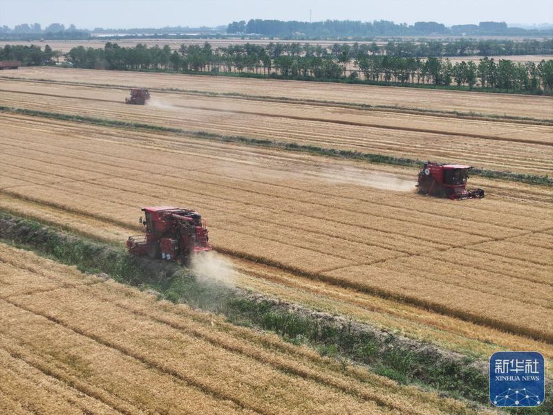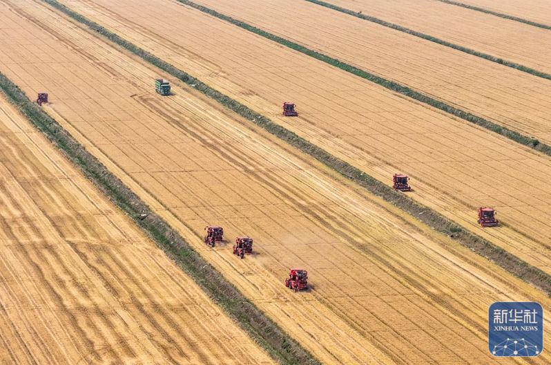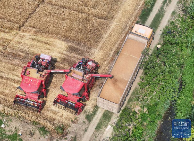 5月28日,收割機(jī)在三河農(nóng)場(chǎng)收割小麥(無人機(jī)照片)。新華社記者 季春鵬 攝
