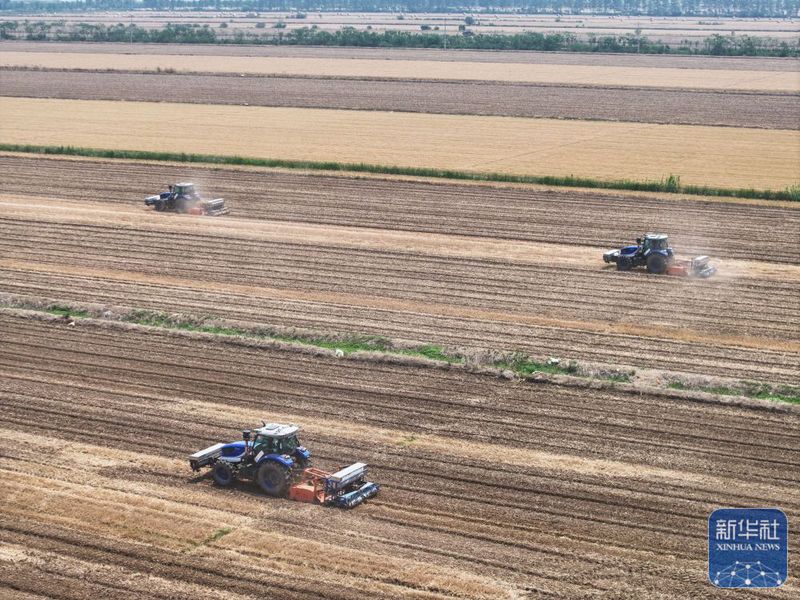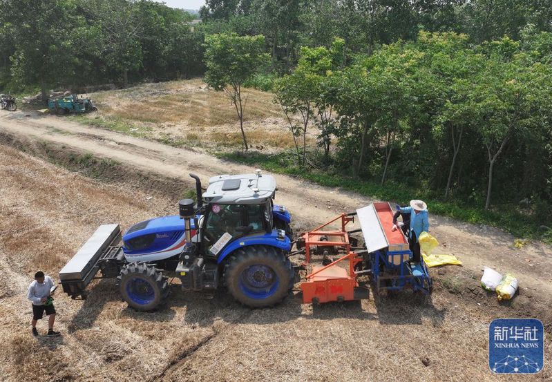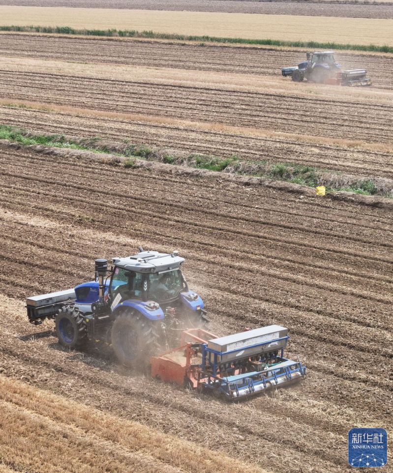 5月28日,揚(yáng)州大學(xué)研制的“九合一”稻麥耕播機(jī)在三河農(nóng)場(chǎng)播稻種(無人機(jī)照片)。新華社記者 季春鵬 攝