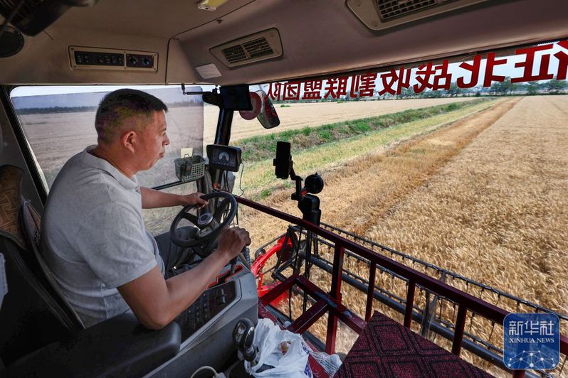 5月28日,江蘇農(nóng)墾三河農(nóng)場(chǎng)農(nóng)機(jī)手操作收割機(jī)收割小麥。新華社發(fā)(許昌銀攝)