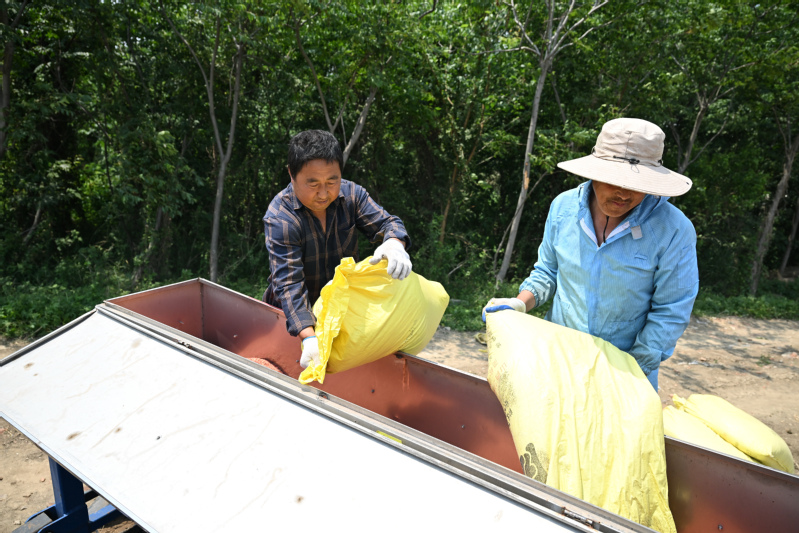 5月28日、「9機能一體型」稲?麥用耕運播種機にもみを補充する三河農(nóng)場の職員。(盱眙=新華社記者/季春鵬)