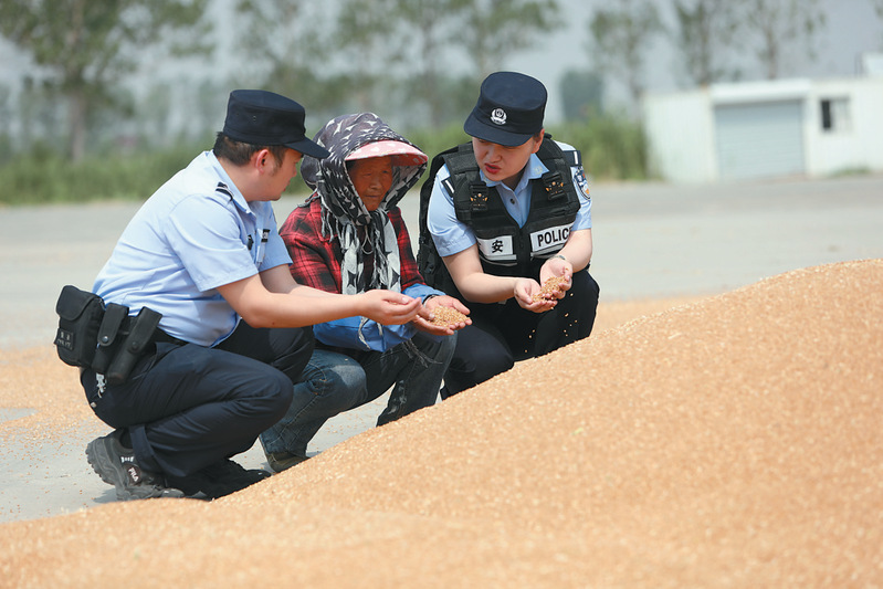 近日,連云港市東辛農場小麥進入大面積機收階段。連云港市公安局徐圩新區分局東辛派出所提前謀劃,周密部署,安排多組警力深入田間地頭、農場曬場,積極開展安全生產作業、防暑降溫、防火防盜等安全提醒,確保麥收平安有序進行。