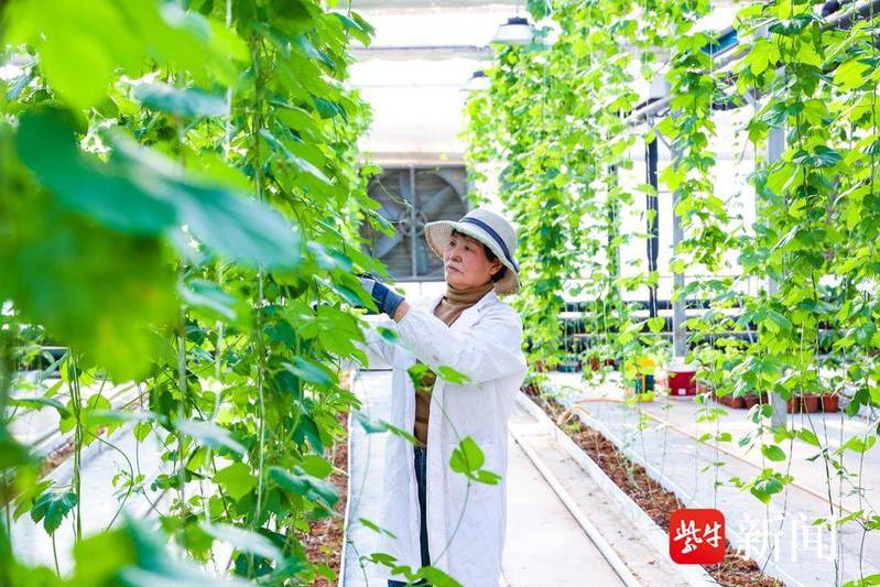 與此同時,在云臺農(nóng)場興墾科技的現(xiàn)代智能玻璃溫室大棚里,另一種特色經(jīng)濟作物正蓬勃生長——啤酒花。一株株啤酒花順著吊蔓繩向上攀爬。這里采用了國內(nèi)領先的無土栽培模式,以粗細椰糠為基質(zhì),配合空氣源溫控、漫散射玻璃、水肥一體化滴灌等先進技術(shù),精準復刻并優(yōu)化了啤酒花的理想生長環(huán)境。
