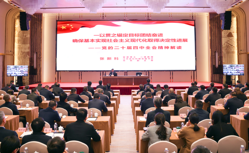 按照省委統(tǒng)一部署,11月19日,學(xué)習(xí)貫徹黨的二十屆四中全會精神省委宣講團(tuán)報告會在江蘇農(nóng)墾舉行。省委宣講團(tuán)成員、省社科聯(lián)黨組書記、常務(wù)副主席張新科作宣講報告。集團(tuán)黨委副書記、總經(jīng)理姜建友主持報告會。報告會上,張新科圍繞學(xué)習(xí)貫徹習(xí)近平總書記在黨的二十屆四中全會上的重要講話精神和全會《建議》,從深刻認(rèn)識黨的二十屆四中全會的重大意義,準(zhǔn)確把握“十五五”時期在基本實現(xiàn)社會主義現(xiàn)代化進(jìn)程中的重要地位,全面理解“十五五”時期經(jīng)濟社會發(fā)展的戰(zhàn)略任務(wù)和重大舉措等方面,結(jié)合我國經(jīng)濟社會發(fā)展實際情況,運用生動案例和翔實數(shù)據(jù),進(jìn)行了系統(tǒng)闡釋和全面解讀。他指出,全會取得的重大成果、作出的重大部署,充分體現(xiàn)了以習(xí)近平同志為核心的黨中央團(tuán)結(jié)帶領(lǐng)全黨全國各族人民續(xù)寫經(jīng)濟快速發(fā)展和社會長期穩(wěn)定兩大奇跡新篇章、奮力開創(chuàng)中國式現(xiàn)代化建設(shè)新局面的歷史主動,必將對黨和國家事業(yè)發(fā)展產(chǎn)生重大而深遠(yuǎn)的影響。要把學(xué)習(xí)貫徹全會精神同學(xué)習(xí)領(lǐng)會習(xí)近平新時代中國特色社會主義思想貫通起來,結(jié)合習(xí)近平總書記對江蘇工作重要講話精神,做到學(xué)深悟透、狠抓落實,奮力譜寫“強富美高”新江蘇現(xiàn)代化建設(shè)新篇章。姜建友在主持報告會時指出,學(xué)習(xí)好、宣傳好、貫徹好黨