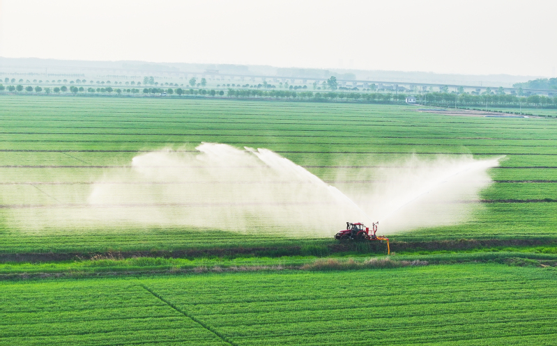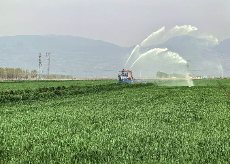 當前正值小麥拔節(jié)孕穗關(guān)鍵期,面對近期持續(xù)少雨天氣,蘇墾農(nóng)發(fā)東辛分公司搶抓農(nóng)時,組織農(nóng)業(yè)生產(chǎn)區(qū)積極做好抗旱保苗等工作。小麥田里,一臺臺拖拉機搭載著專業(yè)灌溉設備,結(jié)合苗情、墑情分片分區(qū)科學澆水,水流均勻地灑落在嫩綠的麥苗間,一道道弧形水幕精準覆蓋農(nóng)田。