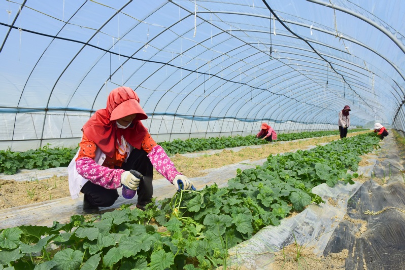走進淮海農(nóng)場高效種植園,大棚內(nèi)一株株青翠欲滴的甜瓜苗郁郁蔥蔥,一朵朵黃燦燦的小花競相綻放、長勢喜人。目前正值授粉關(guān)鍵期,工人們在棚內(nèi)來回穿梭,精心授粉,為今年的豐收打好基礎。據(jù)了解,農(nóng)場采用“羊肚菌+甜瓜”的輪作模式,利用種植菌菇改良后的土壤栽種甜瓜,達到提升甜瓜品質(zhì),一棚兩收、激活土地效益的目的。