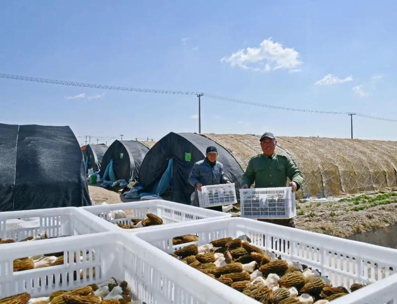 近日,淮海農場首茬菌菇正式上市,采收期將持續至4月底。圖為工作人員正在小心翼翼地搬運杠杠采摘下來的羊肚菌。