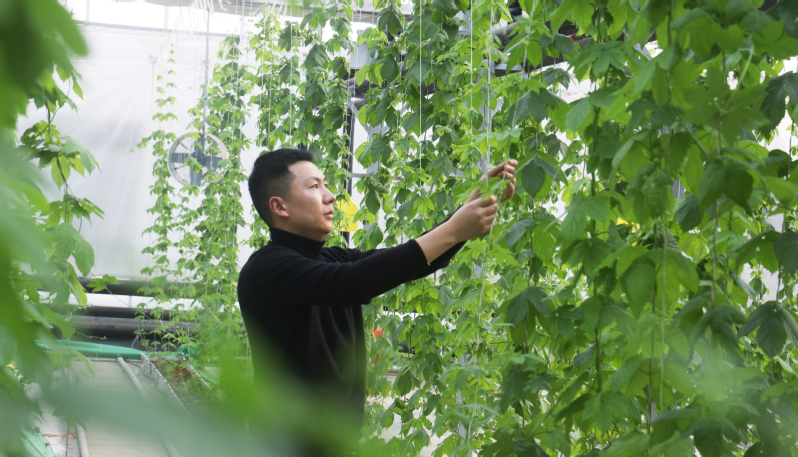 云臺農場利用資源優勢,積極與龍頭企業、科研機構對接,開發特色種植。目前,與蘇墾麥芽訂單種植的大棚啤酒花長勢喜人。圖為技術人員正在為新長出的啤酒花側枝繞蔓。