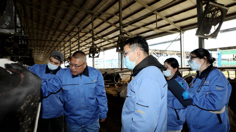 “從外部叩診聲音判斷,這頭牛的肺部已由清音轉為濁音,聽診器中也有明顯的氣泡炸裂聲,要馬上進行治療。”11月19日下午,在東辛東旺奶牛公司生態養殖示范場,一場現場教學正在進行,獸醫主管周文波正帶領獸醫組人員對病癥牛只開展日常巡診。通過觸診、視診、嗅診、聽診、叩診等診斷方法,認真細致檢查牛只體況,周文波“手把手”傳授獸醫組人員如何快速準確診斷病因,做到對癥下藥。“223180號奶牛奶液出現明顯絮狀物,使用頭孢噻呋乳注搭配美洛昔康皮下注射進行治療。213722號奶牛體溫升高,要做好提前干預。在日常巡舍中一定要多觀察多診斷,才能及時發現奶牛體征異樣。”周文波邊查看牛只狀況邊叮囑獸醫組人員。東旺奶牛公司生態養殖示范場存欄奶牛4800余頭,日常的奶牛管護、產后護理、轉群分群及病牛治療等工作任務十分繁重,獸醫組嚴格遵循“日巡查+周例會+月巡診”的工作機制,通過巡棚查看、巡診交流,全面了解掌握牛只的健康與成長狀況,做到有檢查、有治療、有回診,保障疫病防控和奶產品安全供給。“每個月,周主管都會定期帶我們進行巡診,現場診斷指導,我們的業務水平有了明顯提升,工作起來也更得心應手了。”獸醫組工作人員楊華說。東