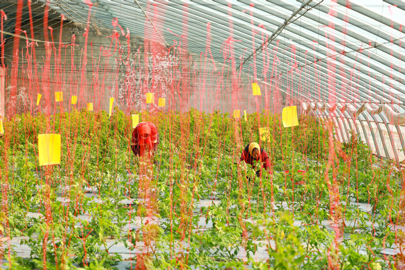 走進云臺農場云水灣濕地公園番茄日光溫室大棚內,一排排番茄藤蔓爬滿吊繩,工作人員正在為番茄進行整枝和打叉,去除番茄植株上的多余側枝和側芽,以增加通風和光照,減少病害的發生,促進番茄健康生長。番茄種植管理,很重要的一個技術環節就是合理控制旺長,農技人員在今年春季番茄種植管理控旺技術上,采取“物理控旺為主、化學控旺為輔”的策略。通過移載活棵后5—6葉期,覆土壓蔓,再在第2—3苔果穗成形后,吊蔓,讓基部2至3個節間基本盤在地膜上。這種物理控旺的方法既能有效控制旺長,又能合理控制株高,免去了后期3次的落蔓工序,有效減少了每畝地400元的用工成本,不僅提高了生產效率,還降低了生產成本,為農場帶來了實實在在的收益。“最早一批番茄明年一月份就可以上市了,每畝地大概可以產出番茄5500-6000斤,我們的番茄口感好,許多顧客都說有‘兒時味道’,反復回購,價格也是居高不下,畝產值能達到5萬元。”番茄基地負責人榮偉樂呵呵地說道。云水灣濕地公園以口感型番茄為主,種有“草莓番茄”和“鐵皮柿子”兩種品種,與傳統番茄品種相比,對溫室大棚栽培的溫度、濕度、水分、光照、營養補給都有更加嚴格的要求,工作人員采取全過程精細