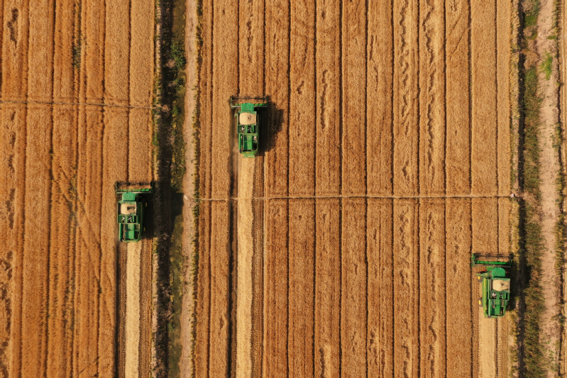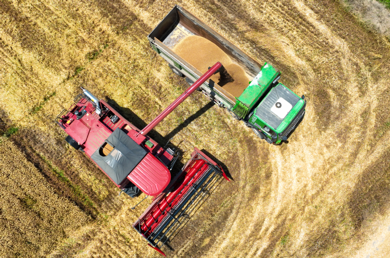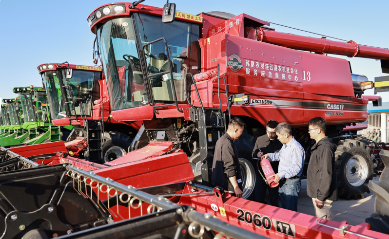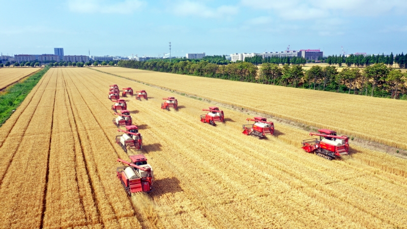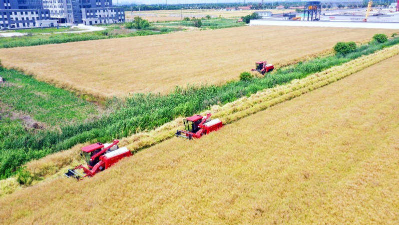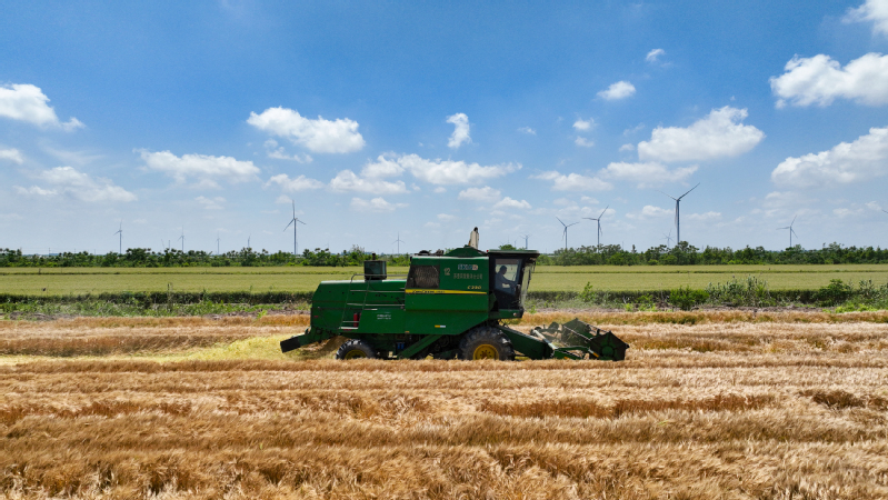 風(fēng)吹麥田千重浪,麥粒漸滿穗金黃。5月22日中午,4臺約翰迪爾C2400大型聯(lián)合收割機(jī)開進(jìn)了蘇墾農(nóng)發(fā)濱淮分公司27大隊(duì)大麥田間,迎來了今年夏收“第一鐮”。伴隨著收割機(jī)陣陣轟鳴聲,一排排大麥被卷入收割機(jī)中,稻穗經(jīng)過脫粒、碎桿等工序后收入機(jī)艙,輸送到運(yùn)糧車上,并拖向場頭翻曬。半天時(shí)間,近300畝大麥?zhǔn)崭罱Y(jié)束。收割現(xiàn)場,農(nóng)水中心和大隊(duì)管理人員在田間檢查收割質(zhì)量。“這是我們今年‘三夏’的首次收割,我們前期對24臺收割機(jī)進(jìn)行檢修、調(diào)試、保養(yǎng),確保農(nóng)機(jī)以最佳狀態(tài)投入到夏收工作中,務(wù)必要把收割損失率降到最低。”農(nóng)水中心副主任孟琪表示。“今年六生產(chǎn)區(qū)大麥單產(chǎn)有望超去年,按照‘三夏’動員會部署,堅(jiān)持質(zhì)量和標(biāo)準(zhǔn)化,搶抓晴好天氣開展收割作業(yè),計(jì)劃在28日前完成六生產(chǎn)區(qū)的大麥?zhǔn)崭罟ぷ鳎浞掷煤冒汛篼湹牟缈趦?yōu)勢,奠定秋糧豐產(chǎn)基礎(chǔ)。”六生產(chǎn)區(qū)主任盧剛說。