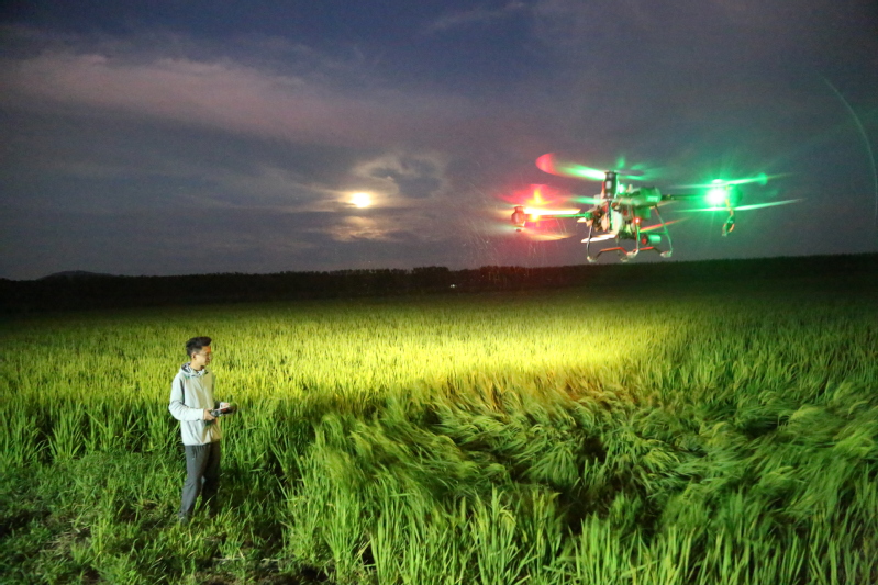 “這塊地是梯形的,等會這塊地飛完,要把地邊找一找,防止漏飛。”8月30日晚,在蘇墾農發(fā)崗埠分公司王溝生產區(qū)葛莊隊的一處田邊,大隊管理員葛高樹正和無人機飛手進行交流,叮囑操作注意事項。在田間,一架大型無人機閃爍著燈光,在飛手的操作下有條不紊地進行噴施作業(yè),所到之處卷起陣陣白霧。眼下正是水稻產量形成的關鍵時期,也是病蟲害高發(fā)時期。連日來,崗埠分公司組織農業(yè)科、生產區(qū)農技人員和大隊管理員,著眼紋枯病、稻曲病、稻縱卷葉螟、稻飛虱等高發(fā)病蟲害,深入田間展開排查統(tǒng)計,分類施策,科學開展肥水管理和綠色防控,抓好4.5萬畝水稻的穗期管理工作。“無人機夜間對水稻進行病蟲害綜合防治作業(yè),避開白天高溫作業(yè)風險,大大提升作業(yè)效率,一臺無人機每小時可噴灑150畝,有力加速防治進程。”崗埠分公司農業(yè)中心負責人表示,無人機飛防不僅作業(yè)效率快,防治效果好,減少農藥使用量,降低農業(yè)生產成本,且能大大降低勞動強度,一舉多得。當前正是穗期水稻病蟲害綜合防治關鍵節(jié)點,分公司共組織無人機40余臺,采取夜間操作,確保在規(guī)定防治時間內完成防治任務,為秋糧豐收打好基礎。近年來,崗埠分公司切實提升農業(yè)現代化水平,注重科技對農業(yè)發(fā)展的影