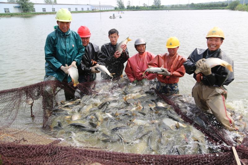 春放秋捕,共話豐收。走進崗埠農場公司南漁場的鯉魚養(yǎng)殖基地,一條條肥美的鯉魚不斷躍出水面,引起水花四濺。8月29日,崗埠農場公司水產養(yǎng)殖中心迎來鯉魚“大豐收”,養(yǎng)殖基地內熱鬧開捕秋天第一網鯉魚。初秋的早晨已然涼意十足,早上不到6點,天剛蒙蒙亮,捕撈人員就來到魚塘開網起魚。在水產公司工作人員的指揮下,一張巨大的漁網隨著捕魚工人的移動緩緩張開,大家不顧冰冷的水下溫度,緊張忙碌了起來。經過鋪底、收網、聚攏等環(huán)節(jié)的共同協作,漁網被慢慢升起……整個現場一片繁忙熱鬧景象。經過近三個小時的忙碌,在大家的精心分揀下,裝滿魚的筐子被吊車有序吊起,稱重、記錄、放魚一氣呵成。“這個吊車頂部的黃色圓塊就是電子秤,吊起魚的同時,秤上的信號就發(fā)到這個無線接收裝置上來,秤重既方便又精準。”現場記賬的方正解釋說。“看這些魚,品相好、質量高,抓都抓不住,活蹦亂跳的,真是大豐收啊!”起魚的工人們雖然全身都已濕透,但是看著手里的大魚,臉上洋溢著收獲的笑容。據悉,本次捕撈的鯉魚名叫“福安鯉”,在春季投放,采取訂單式捕撈銷售。當天,2.2萬斤“淮河牌”福安鯉被送上等候已久的運輸車,銷往本省徐州市及河南省等地。“養(yǎng)殖中心依托豐富水