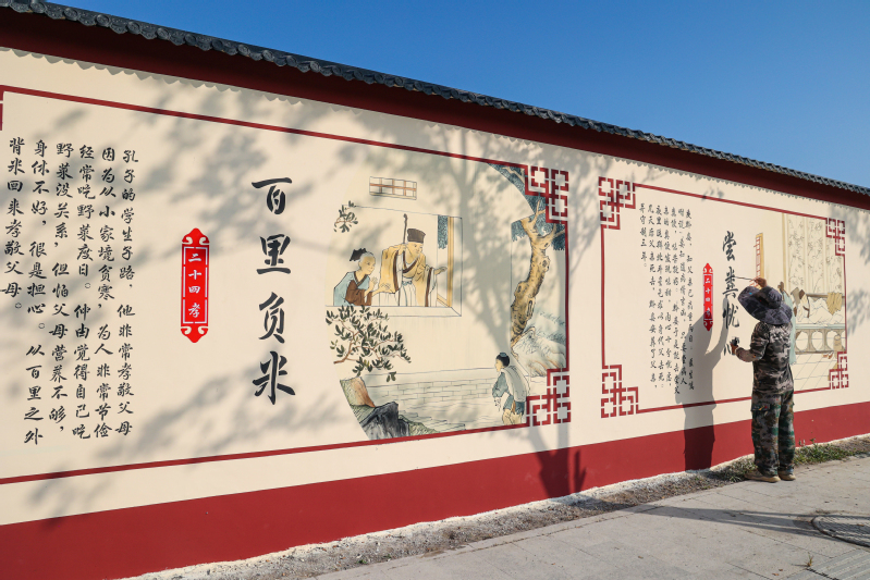 9月7日,在云臺農場普山路街道上,工作人員正在繪制“二十四孝”文化墻,一幅幅生動形象、圖文并茂的文化宣傳內容引人入勝,不僅扮靚了場域環(huán)境,也成為云臺農場引領文明新風的重要手段。