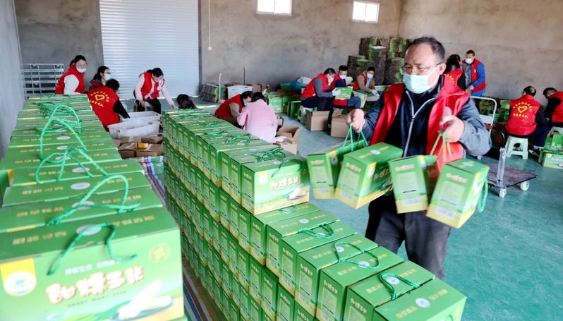 黃海農場在鮮食玉米銷售上大膽創新,采用“全員營銷+專員營銷”的模式,成功開辟出銷售市場新高地,實現銷量與口碑的雙豐收。圖為志愿者正在打包鮮食玉米。
